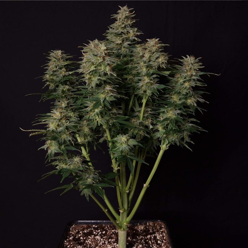 Deze soort onderscheidt zich door zijn compacte hoogte – meestal niet hoger dan 80 cm – wat discreet kweken mogelijk maakt. De bloeitijd bedraagt slechts 5–7 weken en bij de juiste verzorging kan de opbrengst tot 400 g/m² binnen bereiken. Het THC-gehalte van 15,5% zorgt voor een krachtige, intense ervaring, terwijl het minimale CBD-gehalte (0,1%) het effect vooral psychoactief maakt, wat perfect past bij het karakter van deze soort.